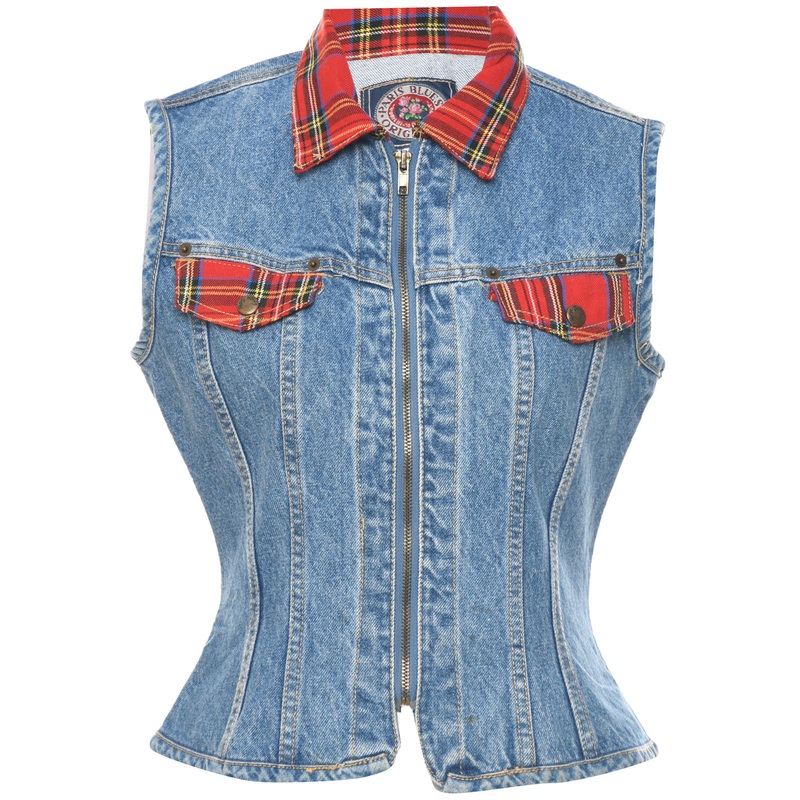 Zip front denim jacket vest comes in medium wash with multiple pockets and contrasting fabric trim.Bust: 35 inchWaist: 30 inchLength: 20 inch